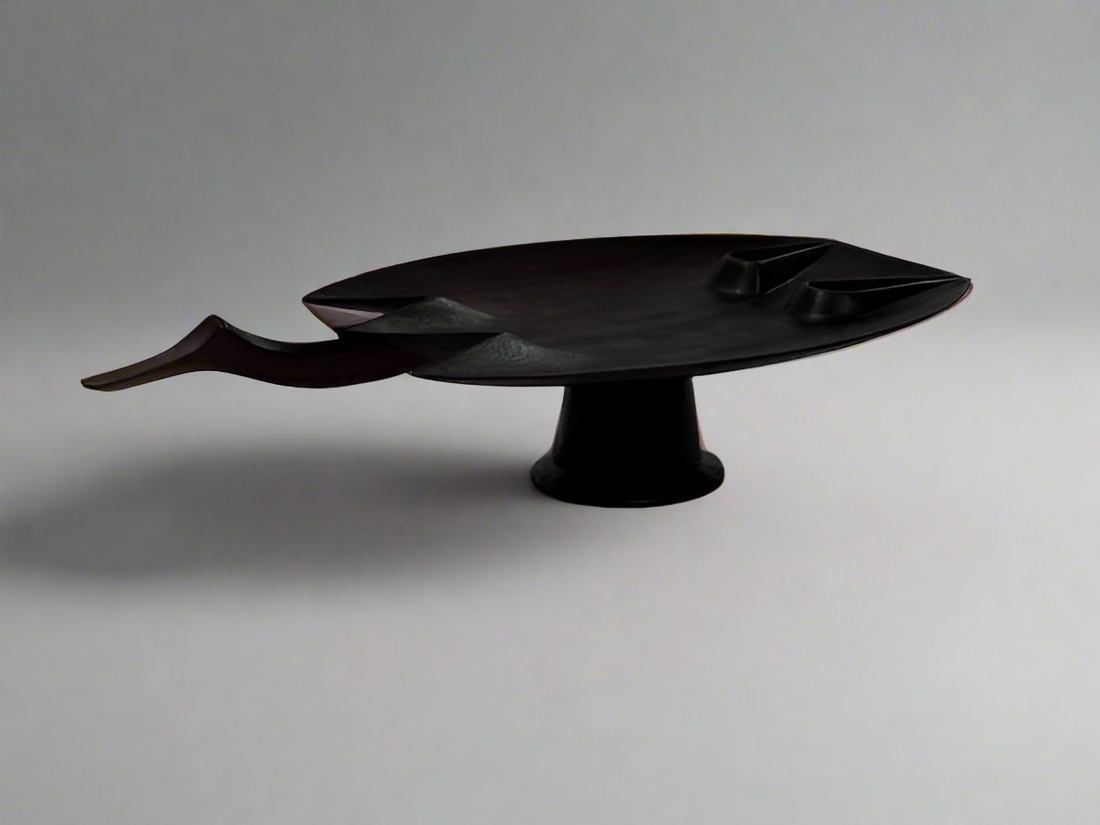 This is an antique carved hardwood dish shaped like a stylised duck. Such vessels were used by...