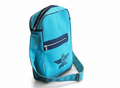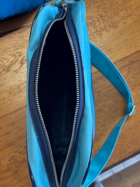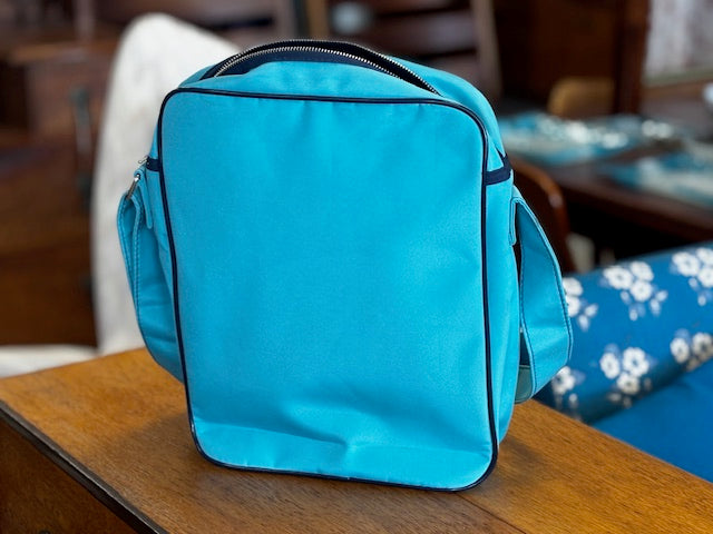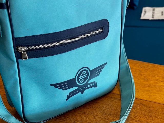 Square shaped teal coloured Air New Zealand shoulder bag. Bag has a metal zip and adjustable shoulder strap. The front metal zip pocket has the text 'air new zealand' with the company white Koru style logo printed in the lower right corner. Dark blue piping the around the front and back edges. Inner base is lined with card.