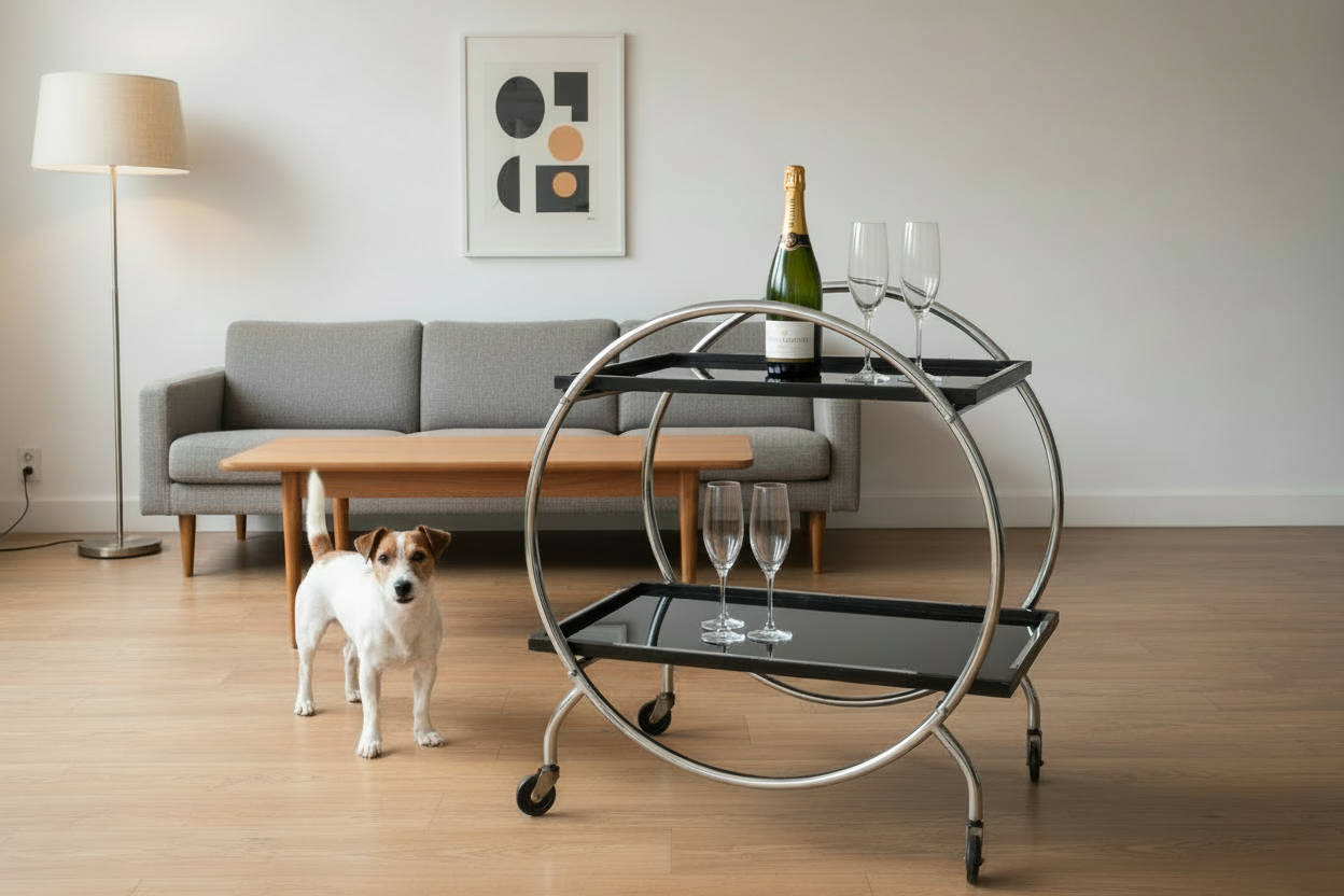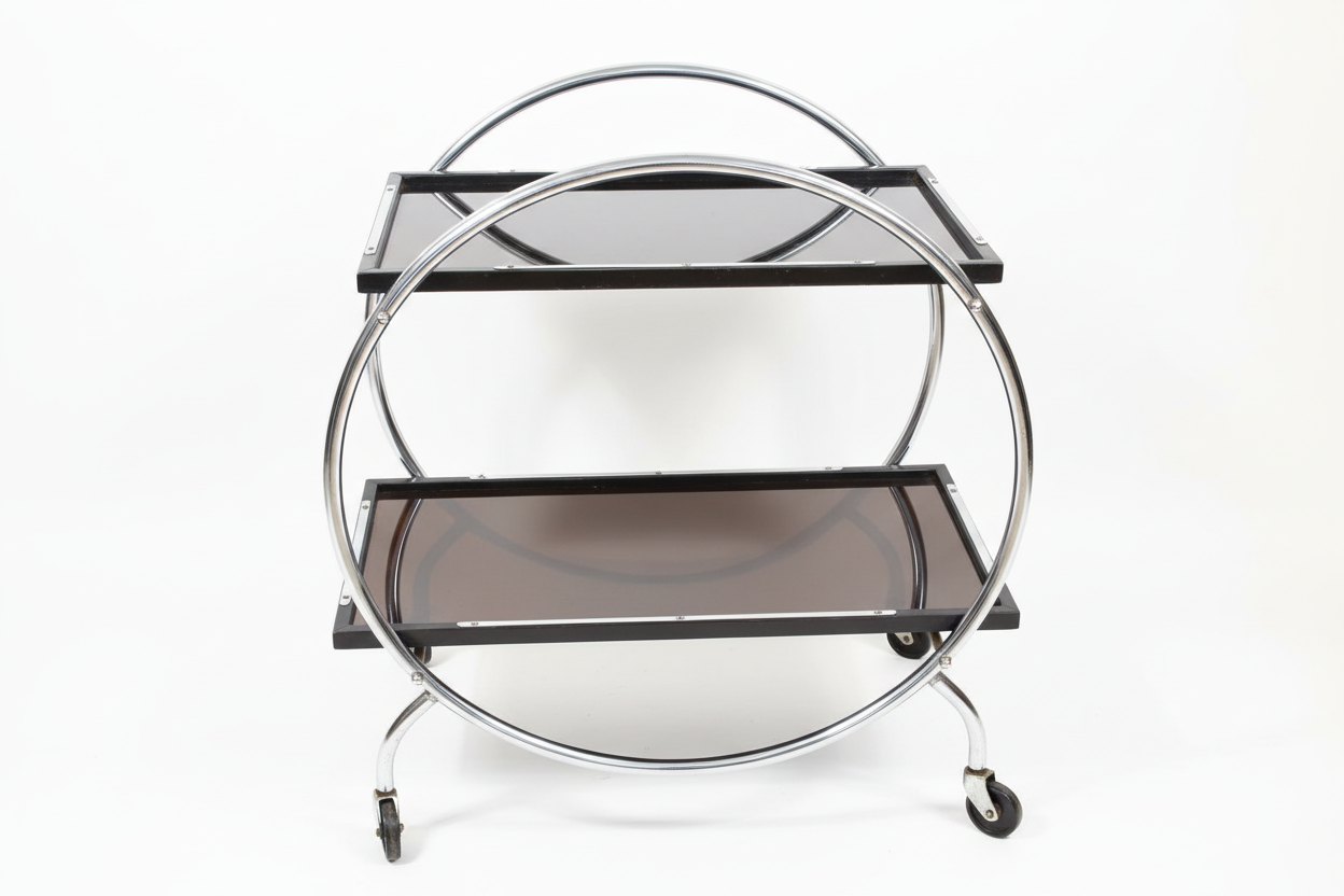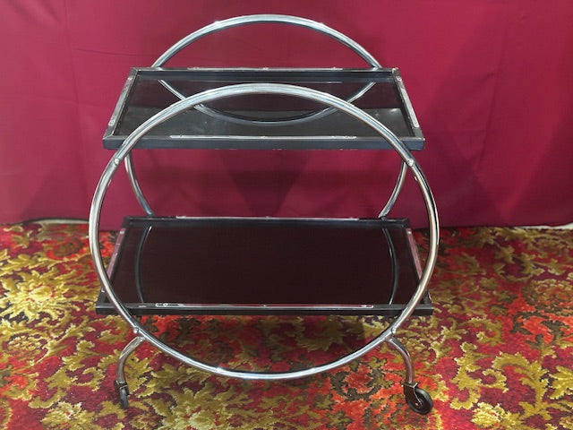 This groovy Art Deco Chrome Trolley has 2 black glass trays on wheels. Handy addition for any home. Place your cocktails, potted plants or books for a cool display.