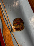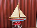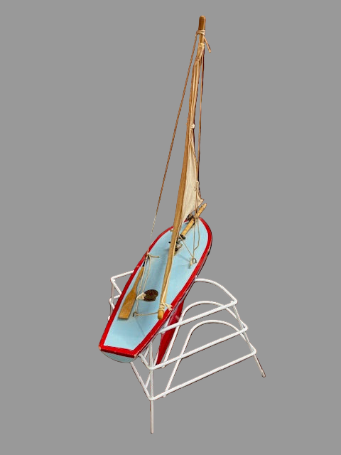 Made in England, this mid 20th century, enameled wood, painted sail boar in red and blue has a SY3 stamp on the sail and a sticker labeled with the brand name and tagline: STAR YACHT "guaranteed to sail", Birkenhead, Made in England.