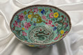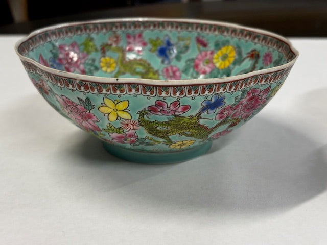 This is a vintage Chinese "Famille Rose" or "Green Famille" porcelain bowl, possibly from the early 20th century, featuring hand-painted dragon and floral motifs. These types of bowls are often described as having an "eggshell" finish due to the extreme thinness and delicate nature of the porcelain.