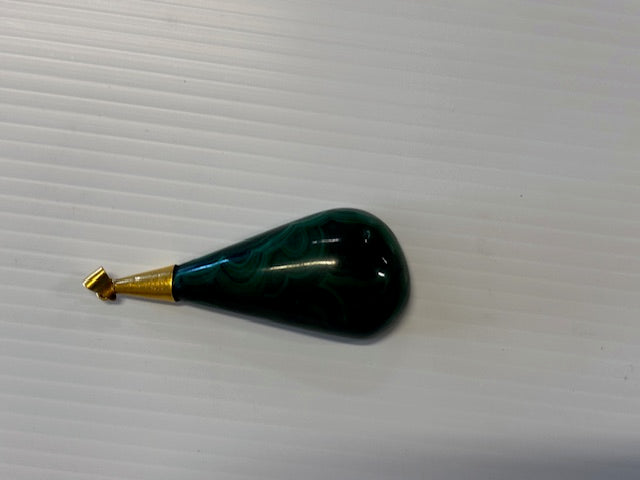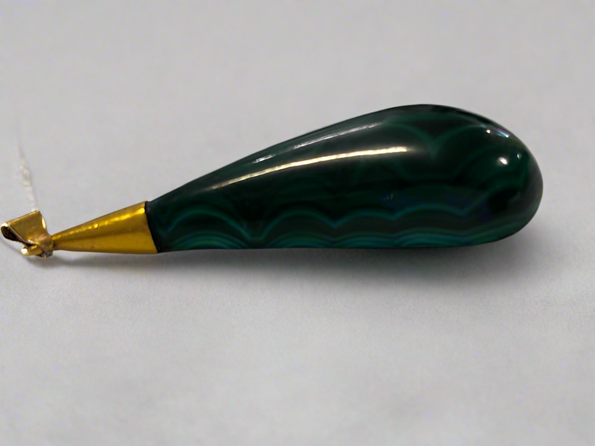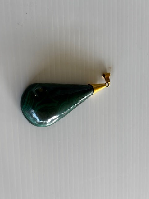 This is a 22ct and 24ct Malachite teardrop style pendant. Measuring 65mm long, the top clasp is 24ct gold and the connection piece to Malachite is 22ct gold. The back of the pendant is flat.