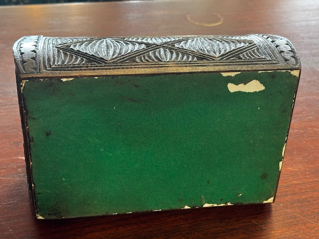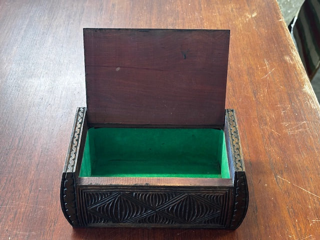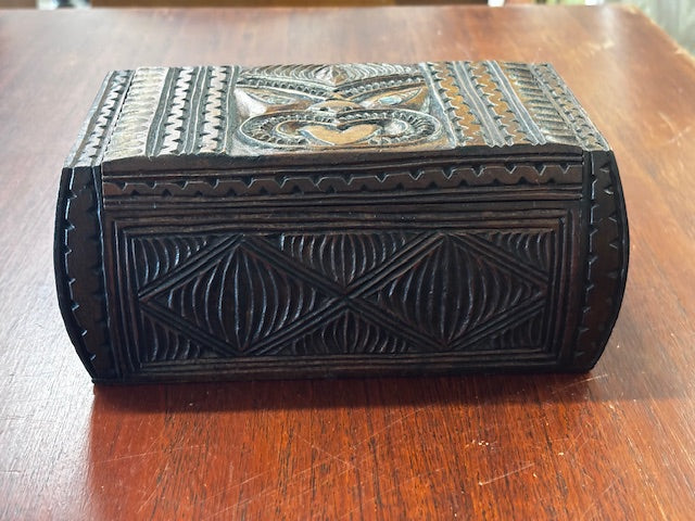 A beautifully carved Maori treasure box, with intricate details on all sides.