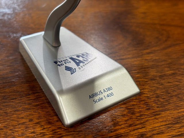 This item is a 1:400 scale diecast metal model of a Singapore Airlines Airbus A380-800, specifically commemorating it as the "First to Fly" the type