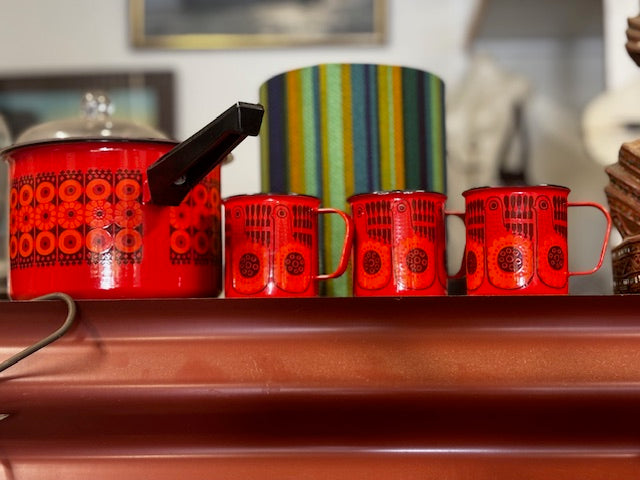 Arabia Finel refers to collectible, colorful vintage Finnish enamelware, a brand used by Wärtsilä (which owned Arabia ceramics) in the 1960s-70s for durable kitchen items featuring iconic designs by famous artists like Kaj Franck, Raija Uosikkinen, and Esteri Tomula, known for adding Scandinavian mid-century modern style to kitchens. These cheerful pots, bowls, and kettles are sought after by collectors for their distinctive patterns, like "Mushroom," "Kehra," and "Sydän" (Heart).